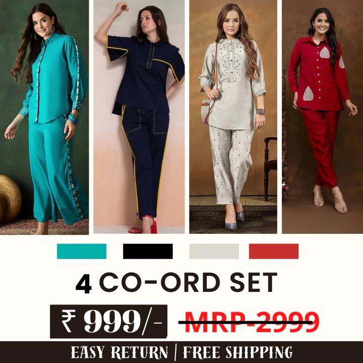 The 4 Co-ord Set Women Combo offers a versatile and stylish wardrobe upgrade for every occasion. This collection includes an elegant ethnic co-ord set, perfect for festive celebrations with its intricate prints and rich fabrics like silk or cotton in vibrant hues such as maroon or emerald green.