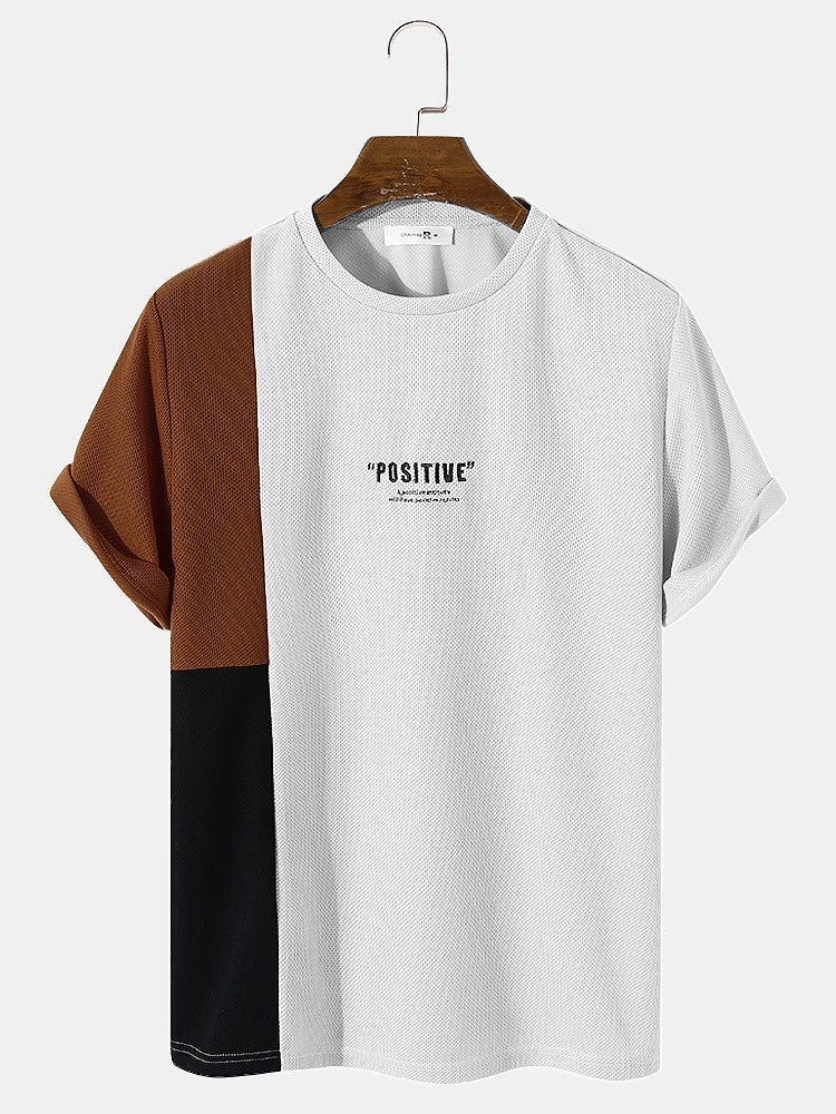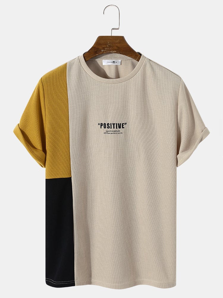 Men's Panel Patchwork Letter Embroidery T-Shirt | Knit Casual Short Sleeve Style