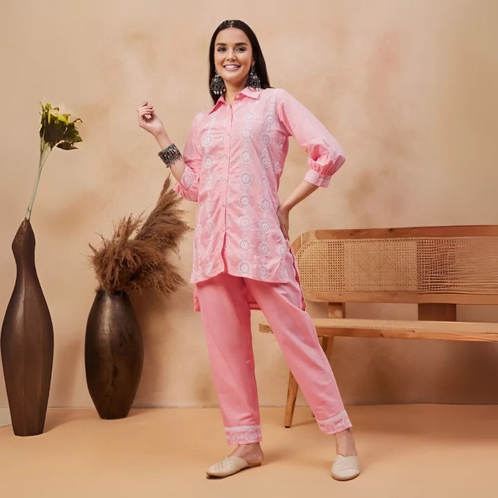 The casual cotton co-ord set is ideal for relaxed outings, featuring breathable fabrics and minimalist designs like stripes or solid colors, ensuring comfort and effortless style.