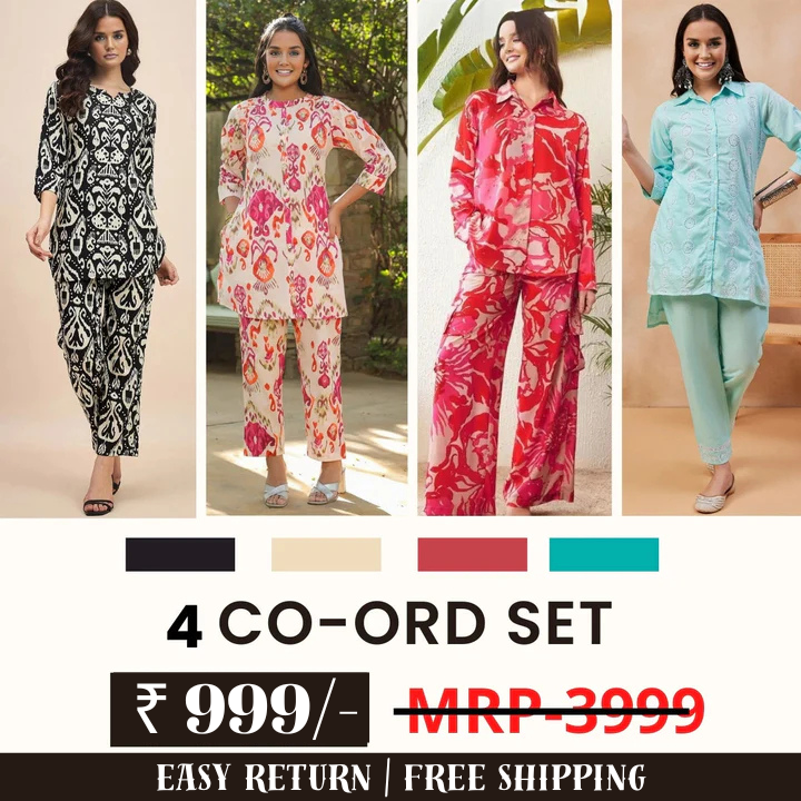 The 4 Co-ord Set Women Combo offers a versatile and stylish wardrobe upgrade for every occasion. This collection includes an elegant ethnic co-ord set, perfect for festive celebrations with its intricate prints and rich fabrics like silk or cotton in vibrant hues such as maroon or emerald green.