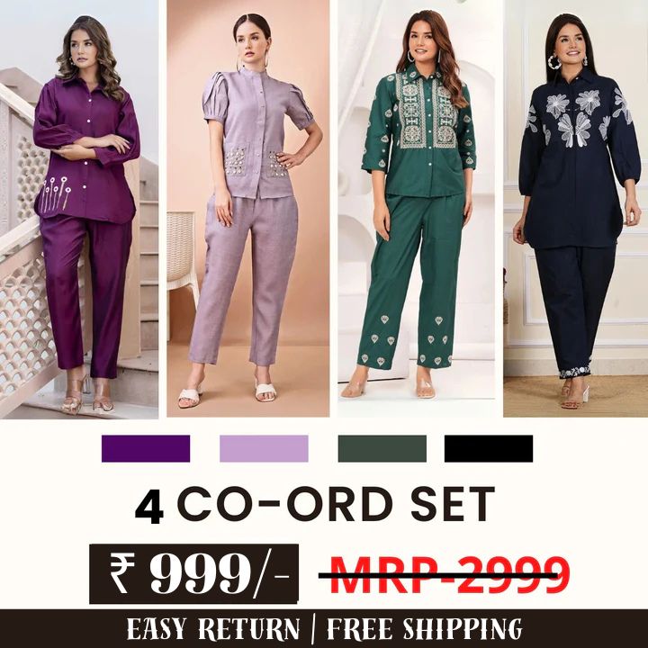 The 4 Co-ord Set Women Combo offers a versatile and stylish wardrobe upgrade for every occasion. This collection includes an elegant ethnic co-ord set, perfect for festive celebrations with its intricate prints and rich fabrics like silk or cotton in vibrant hues such as maroon or emerald green.